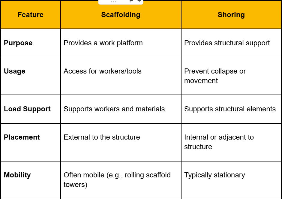 The table below provides a side-by-side comparison to highlight the distinct roles and features of scaffolding and shoring systems: